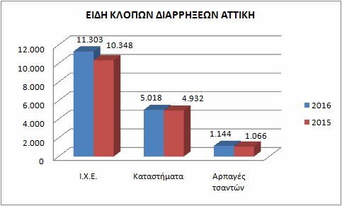 Και στις περιπτώσεις των κλοπών – διαρρήξεων παρατηρούνται αυξομειώσεις στις επιμέρους κατηγορίες και μετατόπιση σε στόχους χαμηλού ρίσκου. Πιο αναλυτικά το 2016, σε σύγκριση με το 2015 καταγράφηκαν: