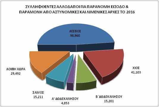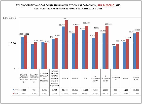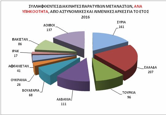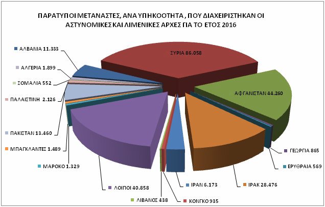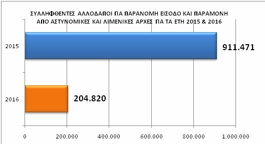 Επίσης το 2016, η χώρα μας διαχειρίστηκε σημαντικά μικρότερο αριθμό μεταναστευτικών και προσφυγικών ροών, κυρίως μέσω των θαλασσίων συνόρων με την Τουρκία, με αποτέλεσμα να συλληφθούν από τις Αστυνομικές και τις Λιμενικές Αρχές, συνολικά (204.820) παράτυποι μετανάστες, έναντι (911.471) το 2015.