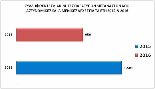 Επιπλέον, το 2016 συνελήφθησαν (950) διακινητές παράτυπων μεταναστών, ενώ το 2015 είχαν συλληφθεί (1.501), ποσοστό μείωσης της τάξεως 36,7 %.