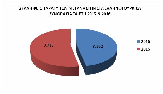 Το 2016 καταγράφηκε σημαντικά μικρότερος αριθμός μεταναστευτικών-προσφυγικών ροών με αποτέλεσμα να συλληφθούν συνολικά (204.820) αλλοδαποί για παράνομη είσοδο και παραμονή στη χώρα, από Αστυνομικές και Λιμενικές Αρχές. Σημειώνεται ότι το έτος το 2015 είχαν συλληφθεί (911.471) , με αποτέλεσμα να καταγράφεται ποσοστό μείωσης πάνω από 77,5 % .