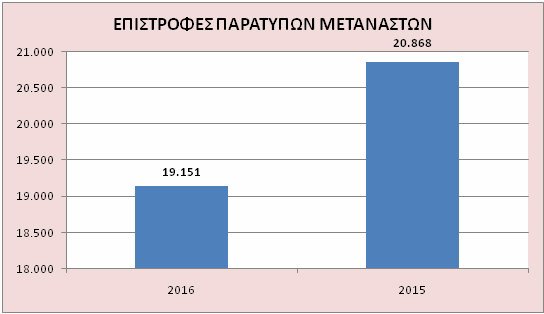 Τo 2016 πραγματοποιήθηκαν συνολικά (19.151) επιστροφές παράτυπων μεταναστών, έναντι (20.868) το 2015. Από αυτές, οι (12.998) περιπτώσεις πραγματοποιήθηκαν μέσω των προγραμμάτων αναγκαστικής επιστροφής και οι (6.153) μέσω των εθελούσιων διαδικασιών επιστροφής.