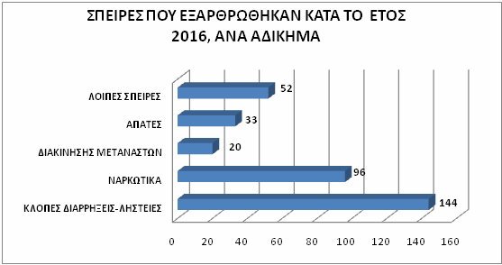 Επίσης η Ελληνική Αστυνομία το 2016 ανταποκρίθηκε σε 622 περισσότερες υποθέσεις απάτης, 600 περισσότερες υποθέσεις κυκλοφορίας πλαστών χαρτονομισμάτων, 290 περισσότερες υποθέσεις ναρκωτικών, 190 περισσότερες υποθέσεις λαθρεμπορίου και 72 περισσότερες υποθέσεις αρχαιοκαπηλίας .