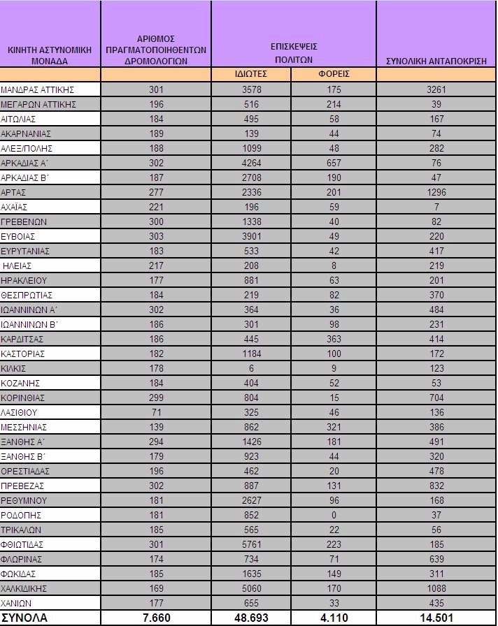 Παράλληλα πραγματοποίησαν (7.660) δρομολόγια ενώ ανταποκρίθηκαν συνολικά σε (14.501) περιπτώσεις αστυνομικού ενδιαφέροντος. Οι περιπτώσεις αυτές αφορούσαν εξυπηρέτηση αιτημάτων πολιτών , θεωρήσεις γνησίων υπογραφής, παροχή οδηγιών και συμβουλών ευρύτερου αστυνομικού ενδιαφέροντος, στους κατοίκους των περιοχών, για την πρόληψη έκνομων ενεργειών σε βάρος τους, την πρόληψη τροχαίων ατυχημάτων και την αντιμετώπιση δυσμενών και ακραίων καιρικών φαινομένων , επίλυση διαφορών, παροχής συνδρομής – βοήθειας και βεβαίωση παραβάσεων του Κώδικα Οδικής Κυκλοφορίας.
