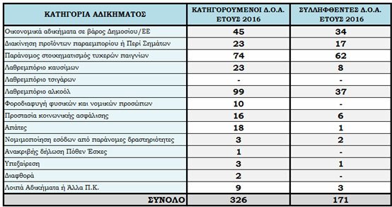 Το έτος 2016 από τη Διεύθυνση Οικονομικής Αστυνομίας περαιώθηκαν συνολικά (375) δικογραφίες, από τις οποίες οι (318) στο πλαίσιο εισαγγελικών παραγγελιών και αστυνομικής προανάκρισης και οι (57) με την αυτόφωρη διαδικασία.