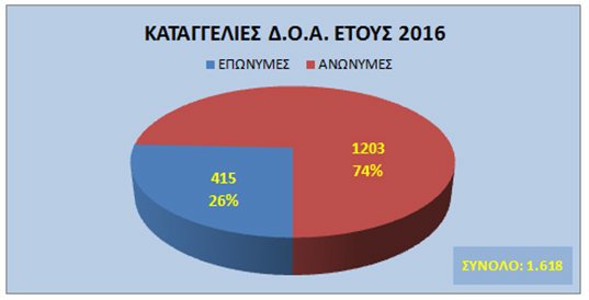 Επισημαίνεται ότι, κατά τη διάρκεια του έτους 2016, η Διεύθυνση Οικονομικής Αστυνομίας, δέχθηκε συνολικά (1.618) καταγγελίες, μέσω του τηλεφωνικού κέντρου 11012 καθώς και από την αλληλογραφία της Υπηρεσίας. Από το σύνολο των καταγγελιών, οι (415) έγιναν επώνυμα, ενώ οι (1.203) ανώνυμα.