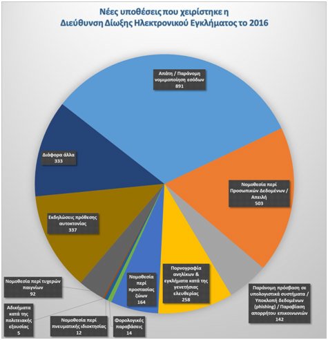 Ο συνολικός αριθμός νέων υποθέσεων που χειρίστηκε η Διεύθυνση Δίωξης Ηλεκτρονικού Εγκλήματος το έτος 2016 ανήλθε σε (2.751). Ο αριθμός αυτός αναφέρεται σε σχετικές εισαγγελικές παραγγελίες, ξεχωριστό προανακριτικό υλικό, εγκλήσεις πολιτών κ.λπ.